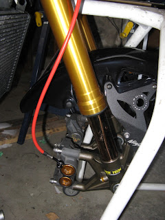 As I am still waiting on the front forks to come back from RaceTech, the front has yet to be test-mounted. I also have a set of wavy zx6r discs that I hope will fit these rims. When I pick those up, I will be sure to post more pics. This picture turned out a bit blurry, sorry.